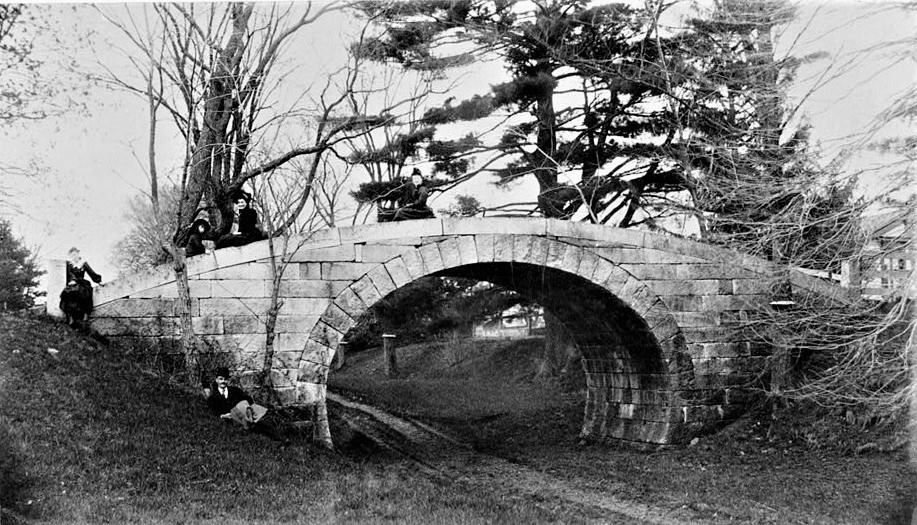 The wall at the southern end of the park is characteristically different than the stones beyond Pomp’s wall. These seem almost architectural and have been dressed square. They could be pieces of the Edward Brooks House. The mansion stood opposite the park until the early 20th century and was demolished to make way for the current neighborhood. The discovery of granite border blocks suggests these might be pieces of the former stone arched bridge over the Middlesex Canal. This structure was designed by George Rumford Baldwin, a son of Loammi Baldwin of Woburn. Father Baldwin designed the canal in 1790 and it cut through the Brooks Estates on its way from Somerville to Winchester. The bridge cost $1,000 and was made from Chelmsford Granite. It survived until the early 20th century and was once a planned focal piece for the residential development. That plan fell through and the structure was demolished. It was long believed that pieces made their way into adjacent foundations or were buried but the presence of a small arched capstone (now in the Brooks Park Wall) suggests these blocks are pieces of that bridge.