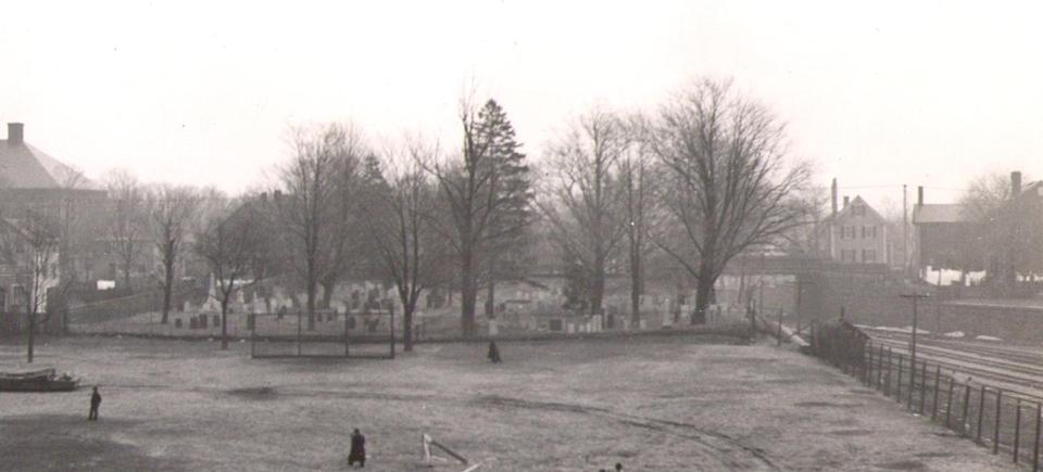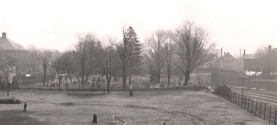 View from the site of City Hall looking east toward Cross Street showing the Cross Street Cemetery.