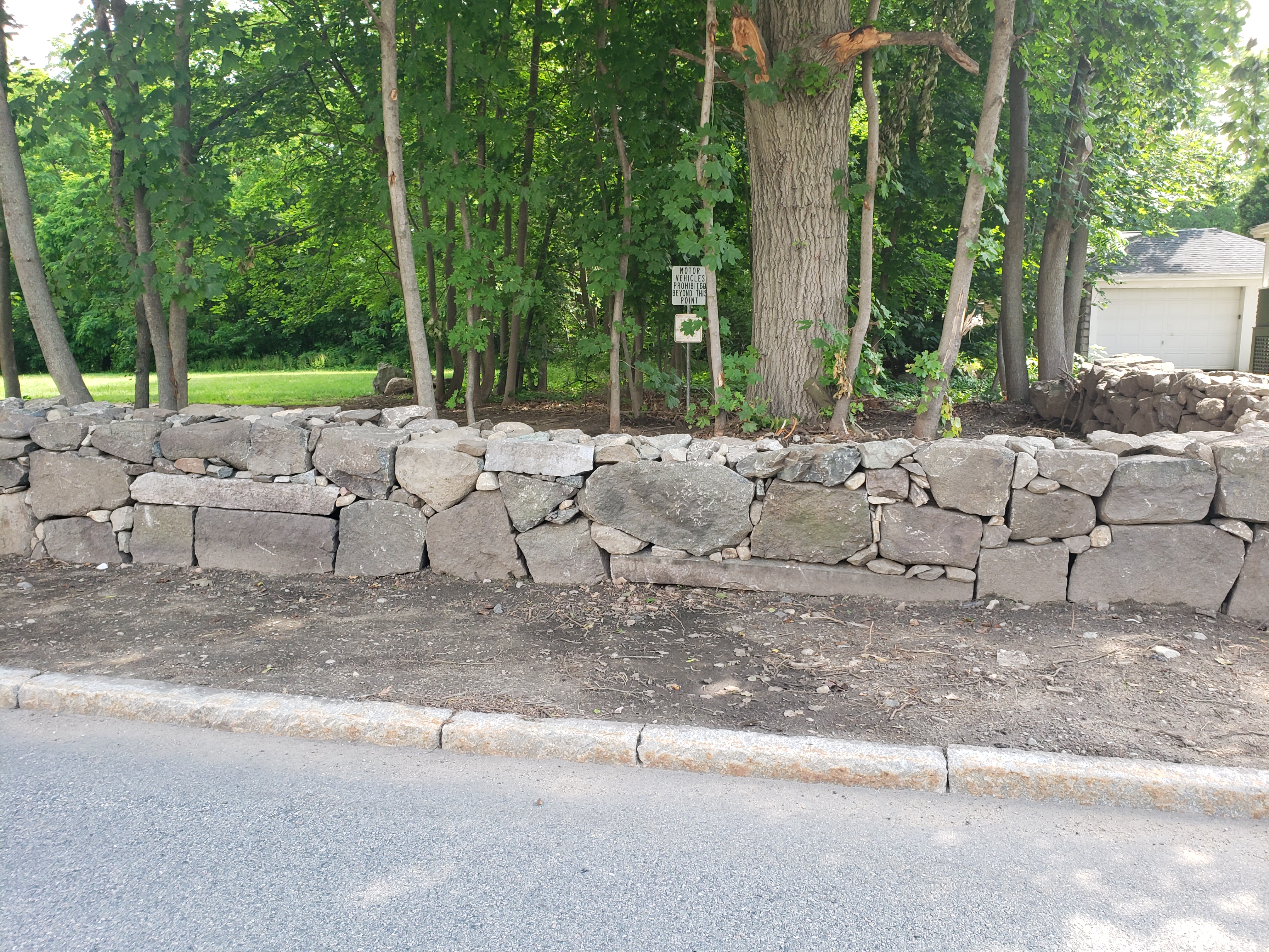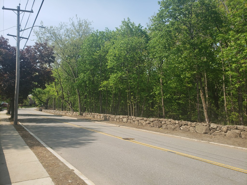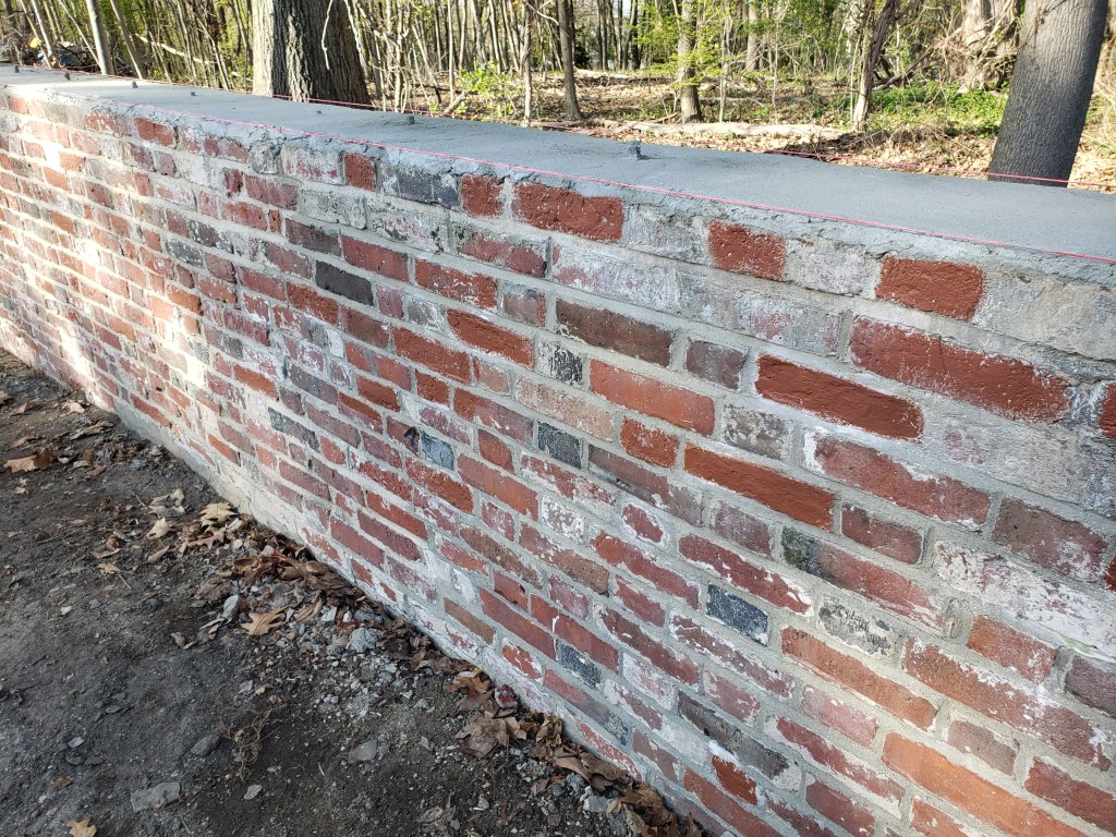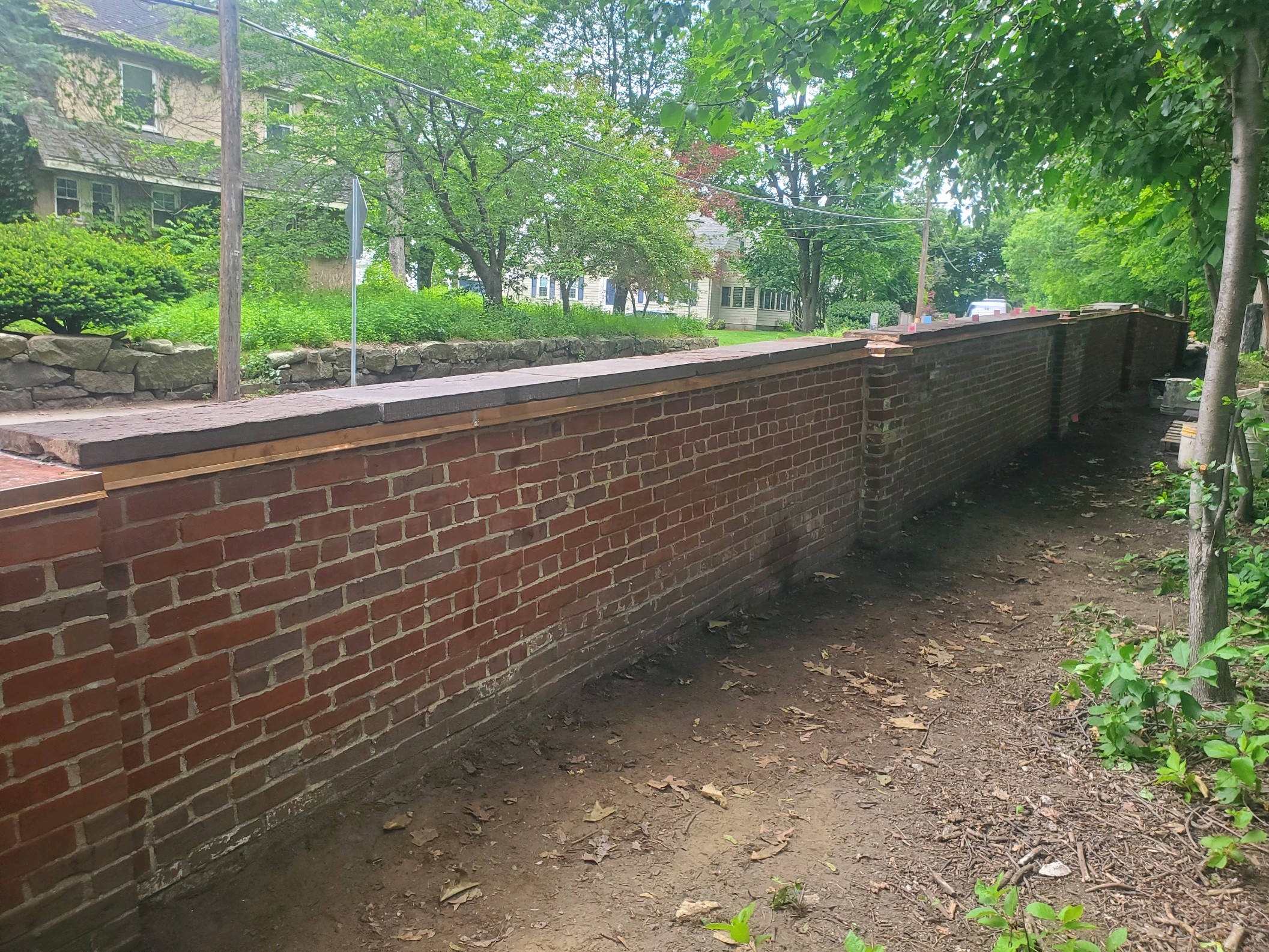 In 2023, the Commission undertook restoration efforts of the two walls that border Grove Street. For the first time in a century, the park has a complete wall from end to end. The brick masonry wall was rebuilt by Richard McGrath of Lunenburg, Massachusetts, and his team of skilled masons. The wall is an important reminder of slavery in New England. It was constructed by an African American man named Pompeii, who was enslaved by Thomas Brooks. The wall is one of two extant architectural elements to survive in Medford. The granite field stone wall was rebuilt by Mark Neves and his masons. It is a dry stacked wall. They have cleared brush behind the wall to allow for construction and they worked with the City to place openings in locations where planned crosswalks and curb cuts will be provided.